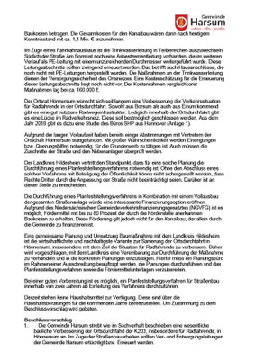 Vorgesehen ist eine Deckensanierung, d.h. die komplette Abfräsung der Deckschicht – vorausgesetzt der Unterbau ist noch tragfähig genug. Vorher muss aber abgeklärt werden, ob der unter der Straße liegende Kanal reparaturbedürftig ist. Dies aber fällt in den Bereich der Gemeinde Harsum, die deswegen in 2023 eine Kanaluntersuchung durch eine Fachfirma ausführen ließ. Die Ergebnisse liegen vor, sind aber (Stand 18.6.24) noch nicht ausgewertet.